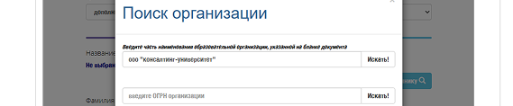 Название организации - нажимаем на кнопку «Найти по справочнику» и в поле поиска вводим ООО “Консалтинг-Университет”. Поиск выдаст результат: Общество с ограниченной ответственностью “Консалтинг-Университет» (ООО «Консалтинг-Университет»). Нажимаем на этот блок